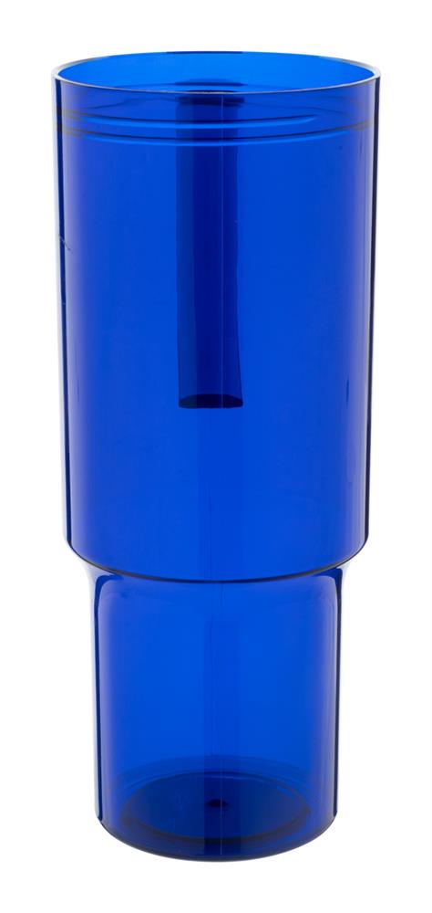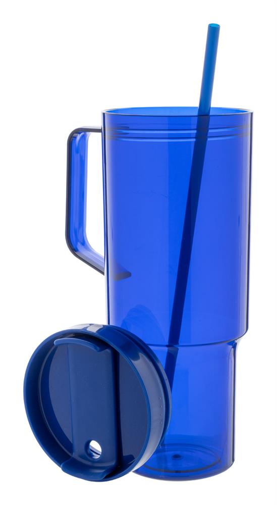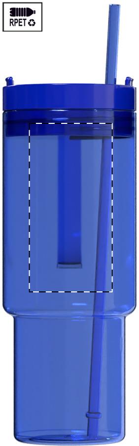 Einwandiger RPET-Reisebecher mit farblich passendem PP-Trinkdeckel und Strohhalm. Füllmenge: 1200 ml.