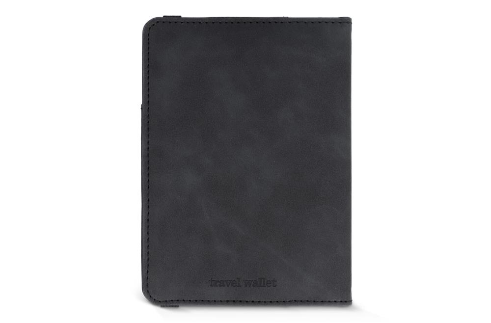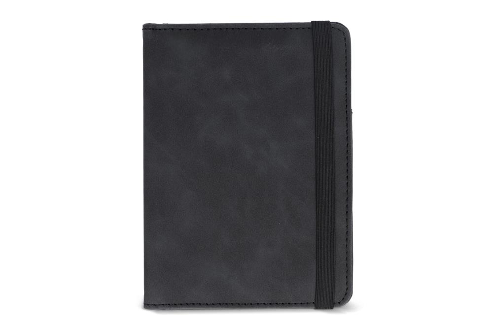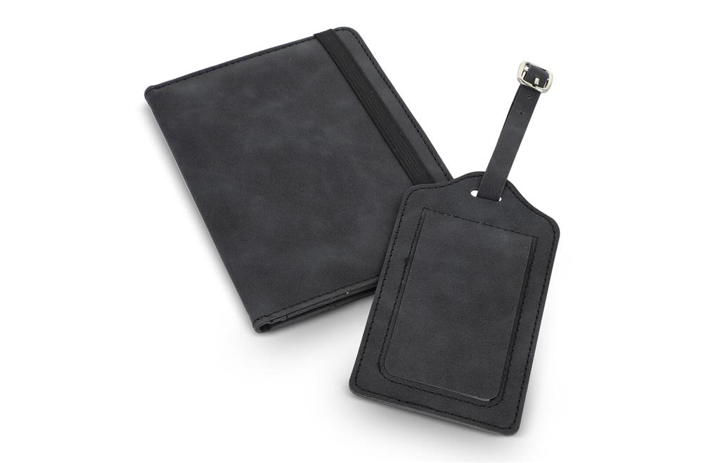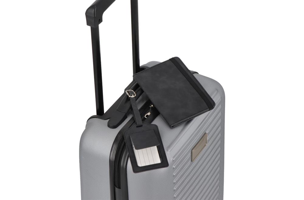 Reiseset mit PU-Reisedokumentetui mit RFID-Schutz, elastischem Verschluss, Platz für Pass, 4 Kreditkarten, 2 SIM-Karten, weitere Fächer (z. B. Bordkarten). Inkl. Gepäckanhänger mit Schnallenriemen und Kontaktkarte (Name, Telefon, Adresse, E-Mail) auf Englisch.