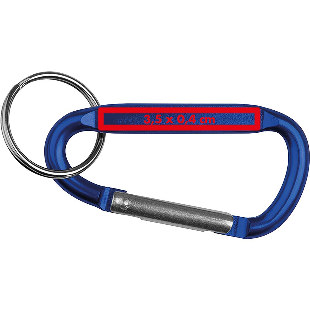 Schlüsselanhänger aus Aluminium mit einem Karabinerhaken. Ihre Werbung lasern wir auf die flache Seite gegenüber der Öffnung.