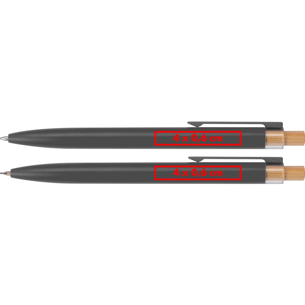Schreibset bestehend aus einem Kugelschreiber mit blau schreibender Mine und einem Druckbleistift aus recyceltem Aluminium, mit Metallclip und Bambusdrücker in einer Papierbox. Ihre Werbung wird auf beiden Schreibgeräten rechts vom Clip graviert. (Gravurpreis für beide Schreibgeräte)
