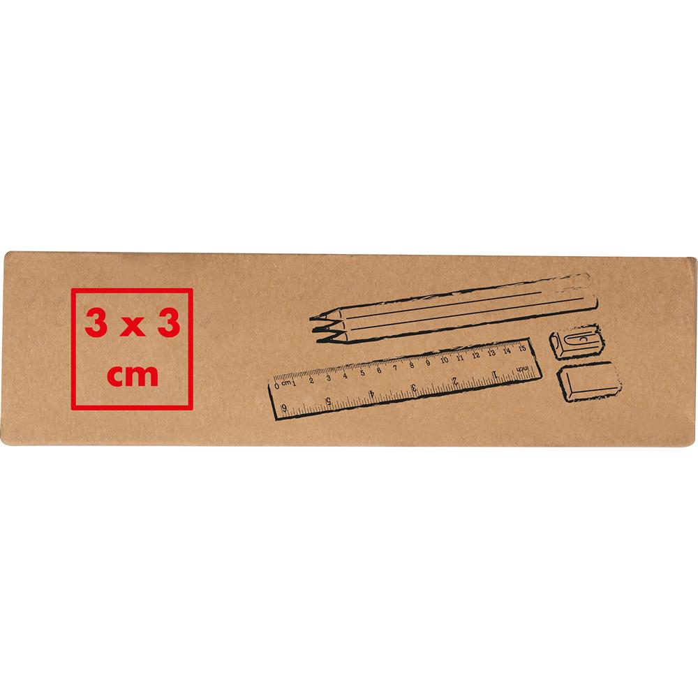 Schreib- und Zeichenset mit 3 Bleistiften in verschiedenen Härtegraden, Lineal, Radiergummi und Spitzer. Die Werbung wird auf die Verpackung gedruckt.