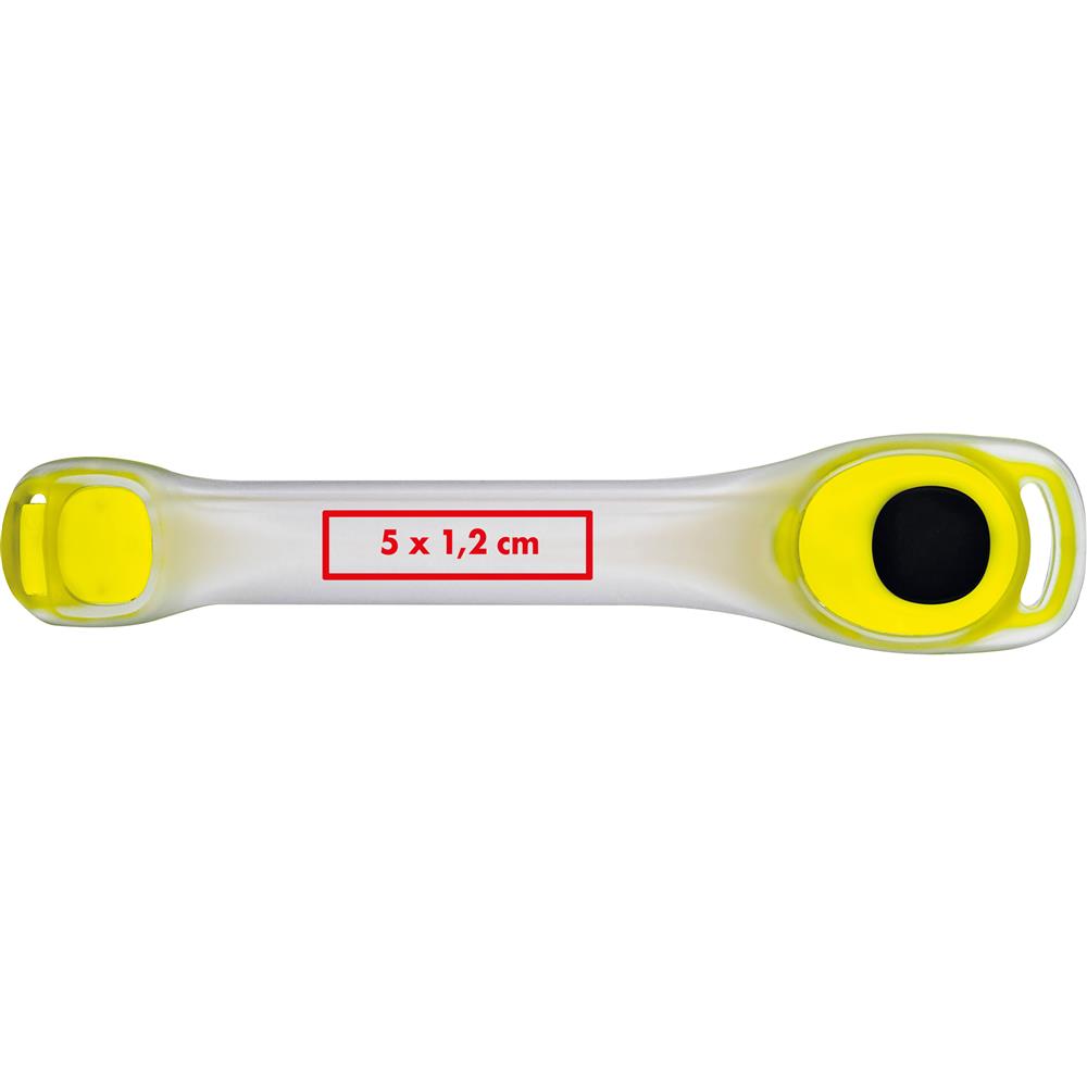LED Armband mit Reflektorstreifen lässt sich durch das flexible Gummiband mit Klettverschluss einfach am Oberarm befestigen. Durch Drücken des schwarzen Knopfes werden die beiden roten LEDs aktiviert. Es kann Dauerlicht oder Blinken eingestellt werden. Ihre Werbung wird mittig auf das Kunststoffteil gedruckt.
