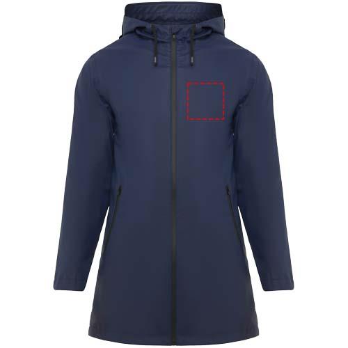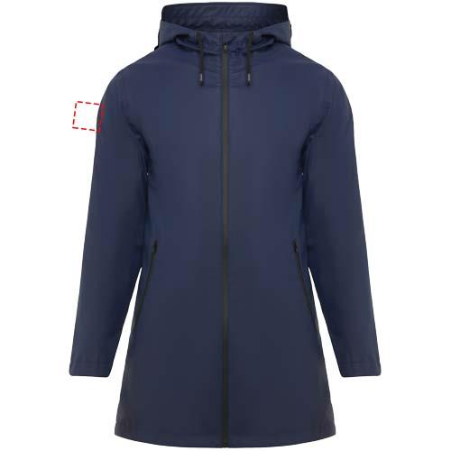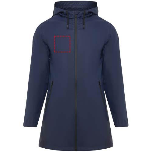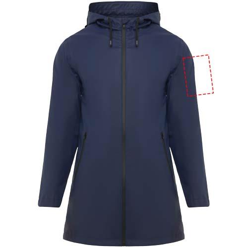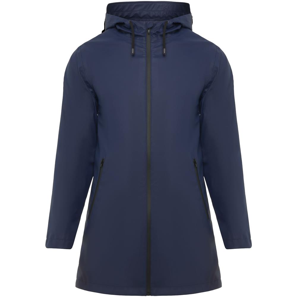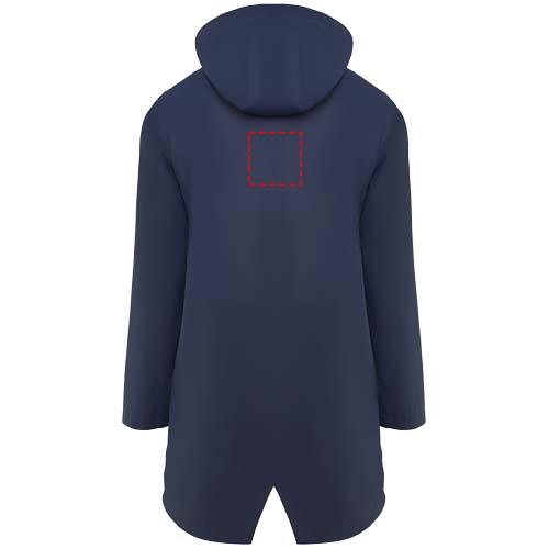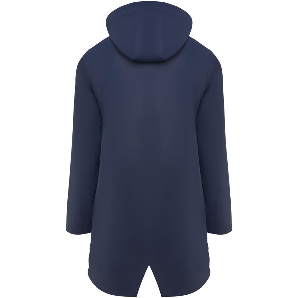 Wasserdichter Regenmantel. Kapuze mit Schirm. Hitzeversiegelte Reißverschlüsse und Nähte. Kontrastierende Details in Schwarz. Zwei Seitentaschen mit Reißverschluss. Schlitz am hinteren Saum. Abnehmbares Etikett. Wasserdicht. Das Modell ist 179 cm groß und trägt Größe S.