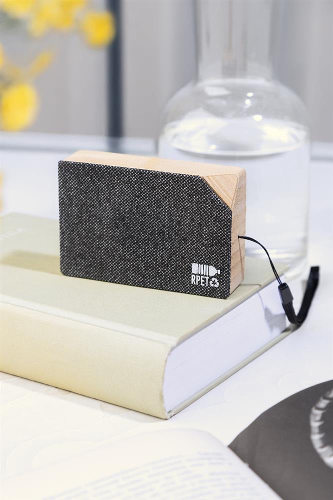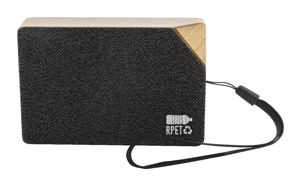 Kabelloser Lautsprecher aus Bambus mit Mesh aus RPET-Polyester, integriertem Solarladegerät, Trageschlaufe und wiederaufladbarem Akku (300 mAh). Inklusive USB-Ladekabel.