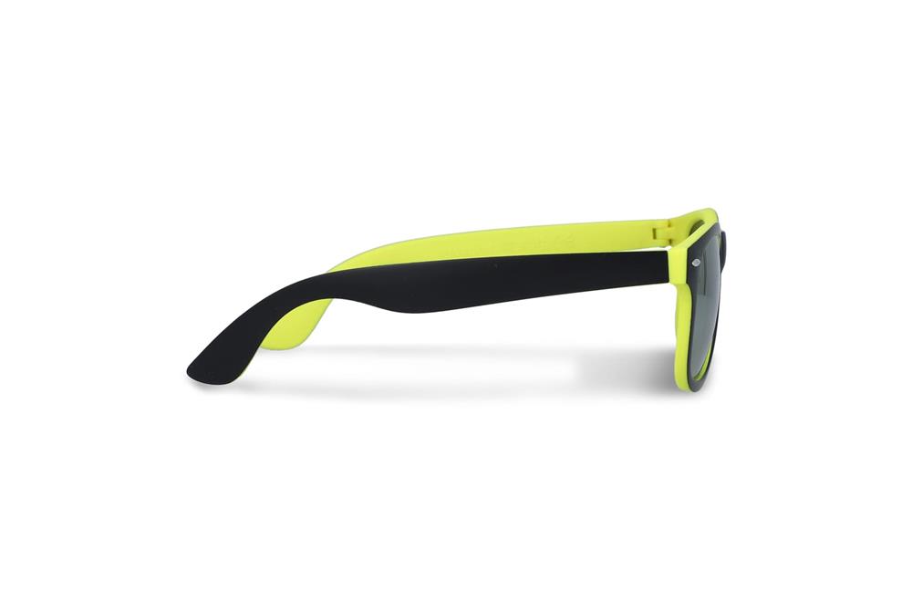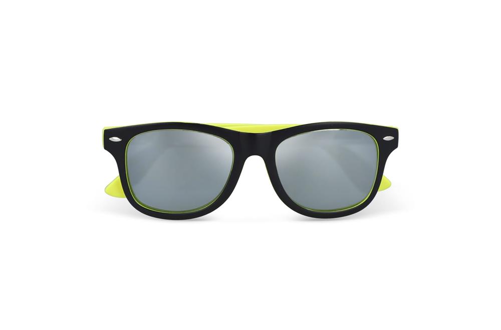 Stylische Sonnenbrille mit trendigem zweifarbigem Rahmen und auffälligen Spiegelgläsern. UV400-Filter. Eine moderne Wahl für auffällige Promotions und Events.