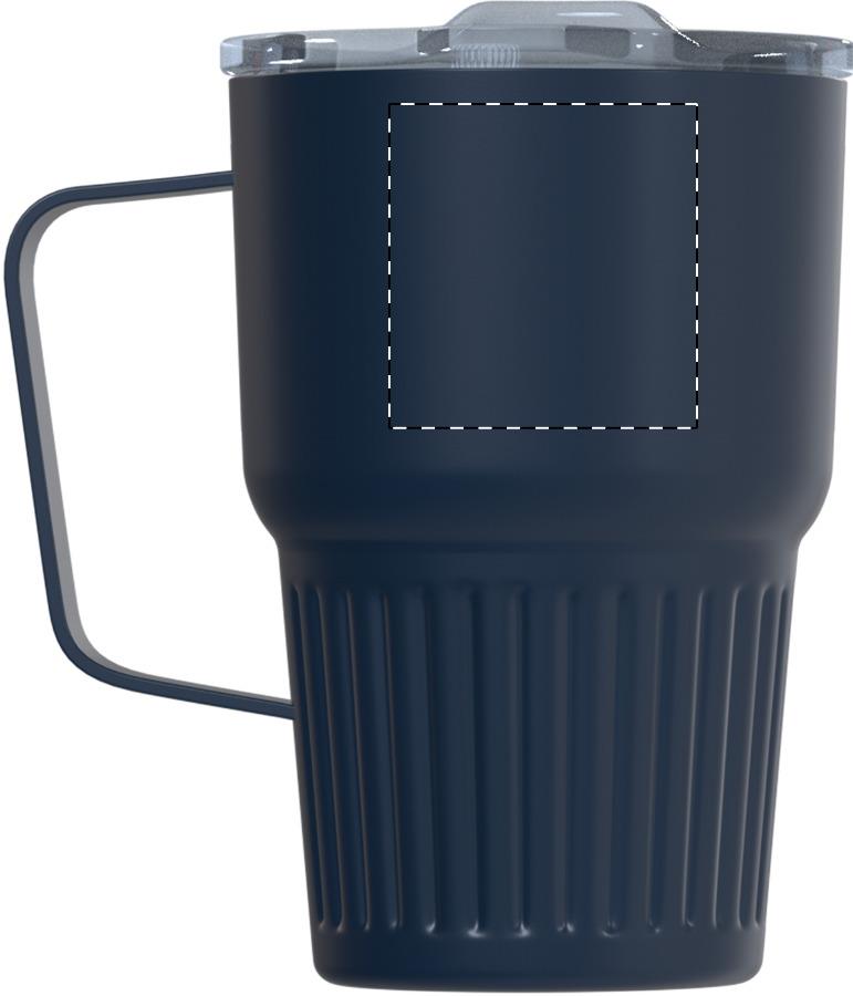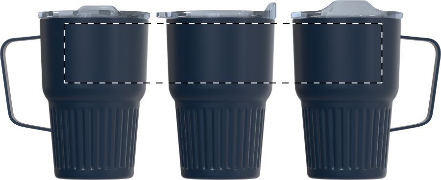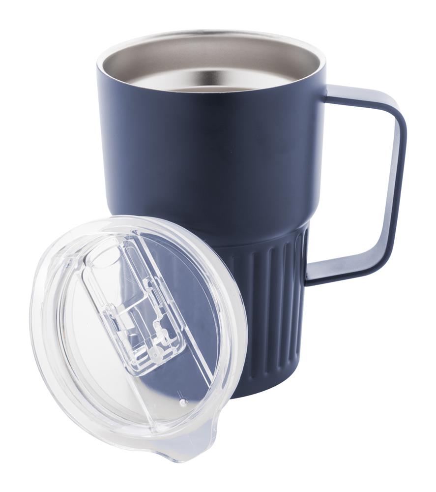Doppelwandiger, isolierter Thermobecher aus recyceltem Edelstahl mit Trinkdeckel aus ABS-Kunststoff. Füllmenge: 470 ml.