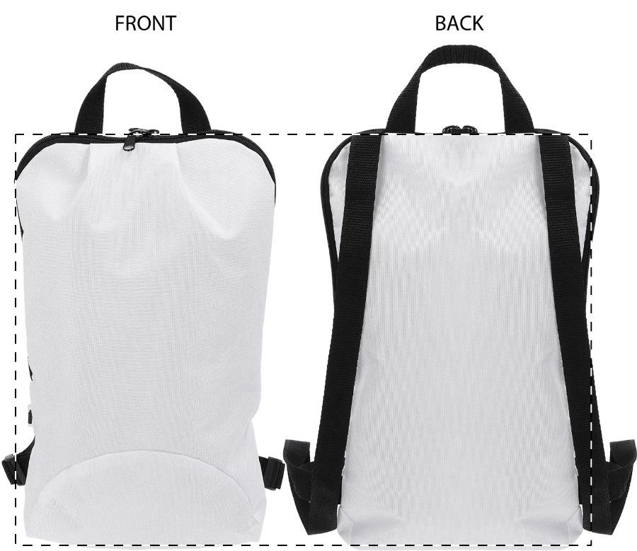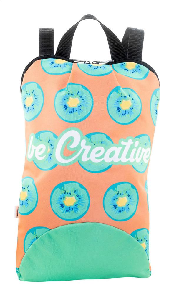 Individueller RPET-Mini-Rucksack mit Reißverschlussfach. Mit vollflächigem Sublimationsdruck. Material: 600D RPET-Polyester. Mit RPET-Label. Mindestmenge: 25 Stk.