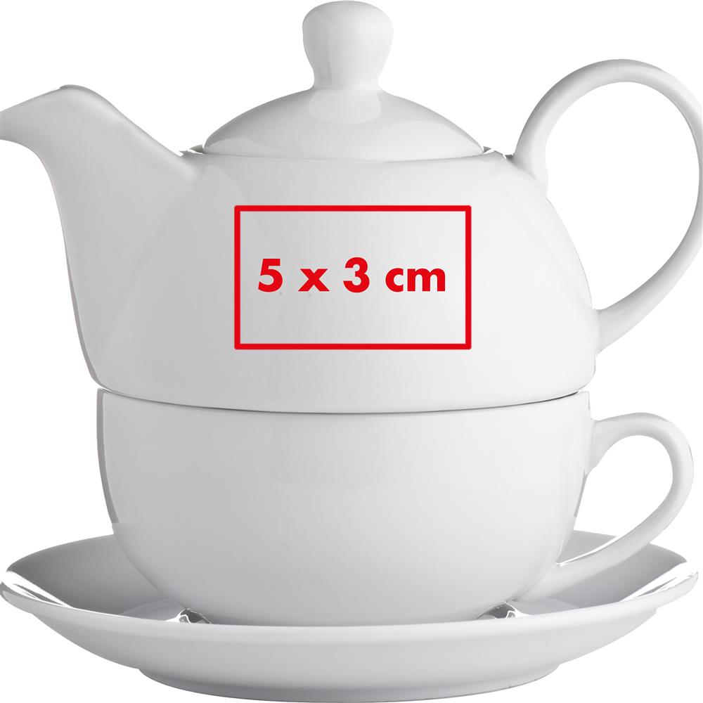 Teeset mit einer Teetasse (200ml), Kännchen (400ml) und Unterteller aus hochwertigem Porzellan für besten Teegenuss. Die Teekanne eignet sich besonders für Ihre Werbung, welche wir im Keramiktransfer anbringen.