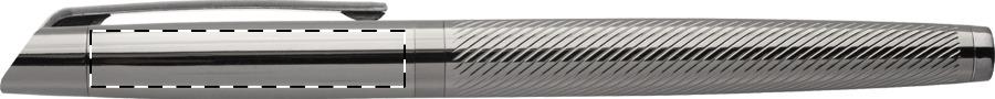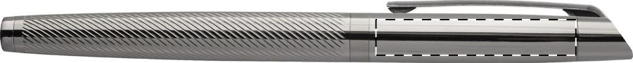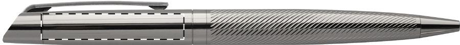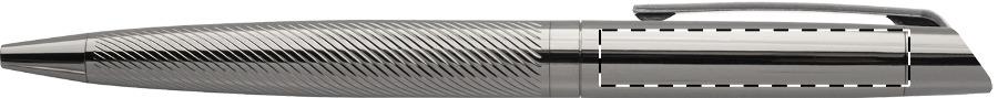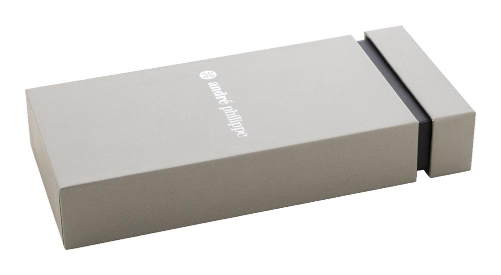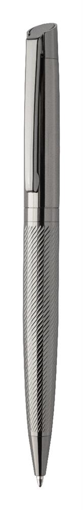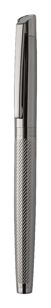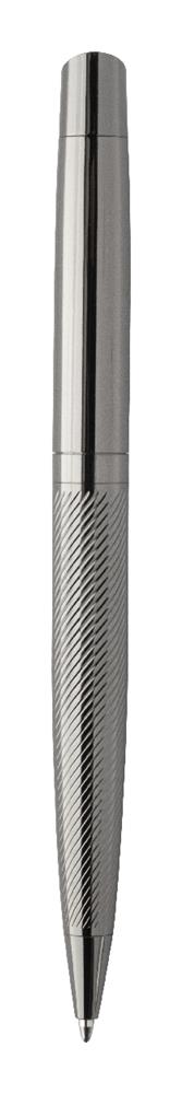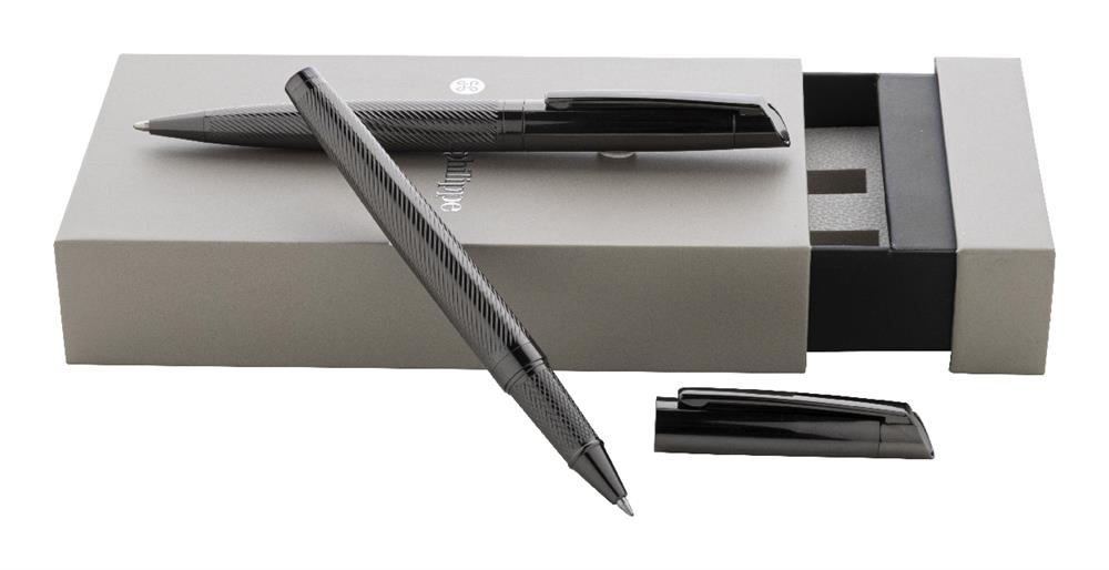 Elegantes Kugelschreiber- und Tintenroller-Set aus Metall mit diagonal strukturiertem Schaft, blauschreibend. In zweifarbiger Geschenkbox. Marke: André Philippe.