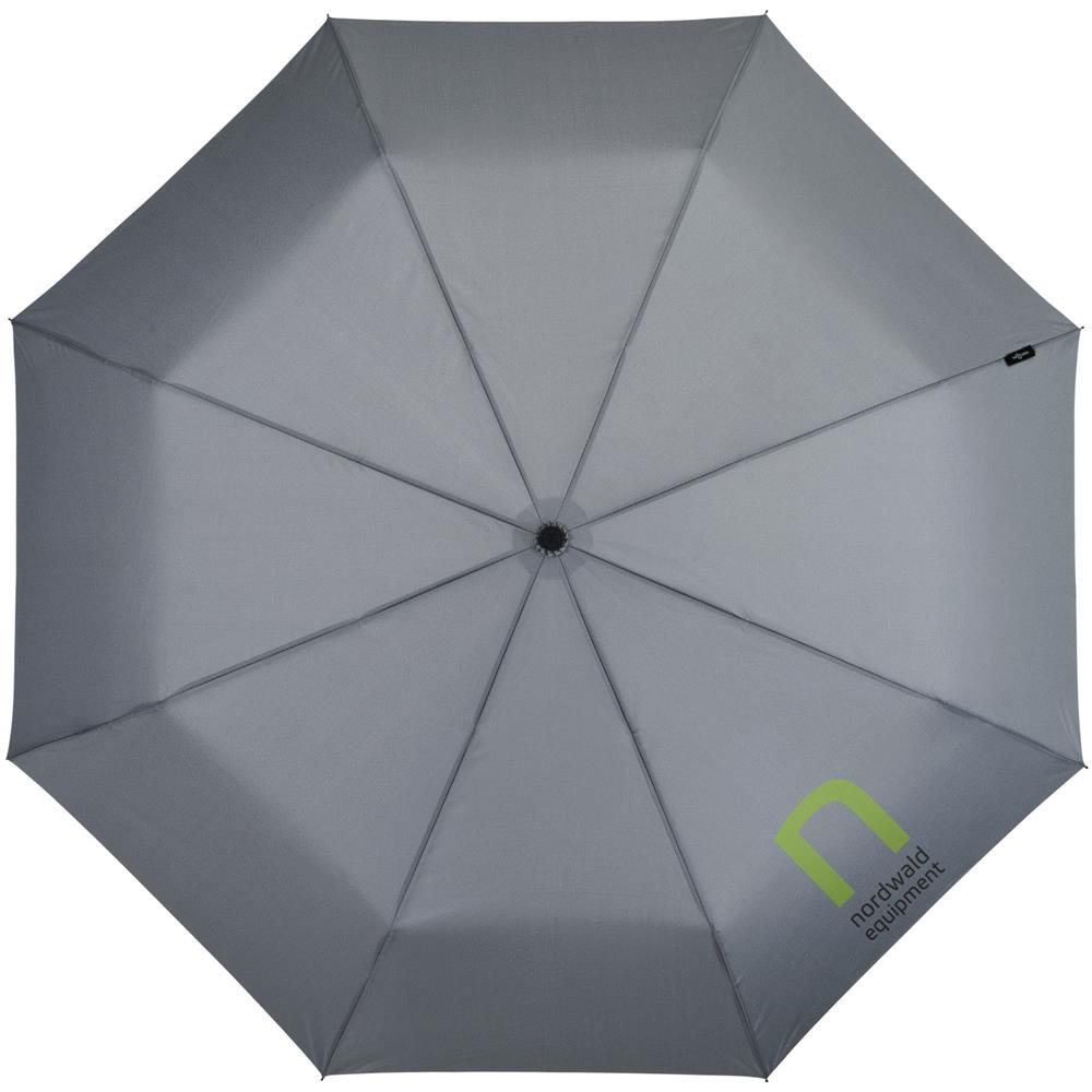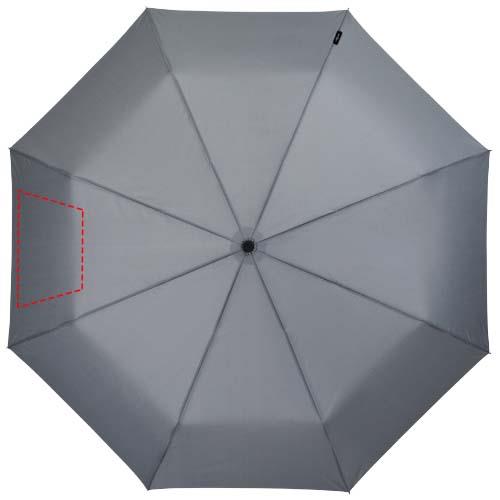 Automatisch öffnender und schließender Schirm mit 3 Segmenten im exklusiven Design. Schwarzer Metallschaft, GlasfaserSpeichen und gummibeschichteter Kunststoffgriff. Wird mit farblich zum Baldachin passender Hülle geliefert. Kann auf 31 cm zusammengefaltet werden.