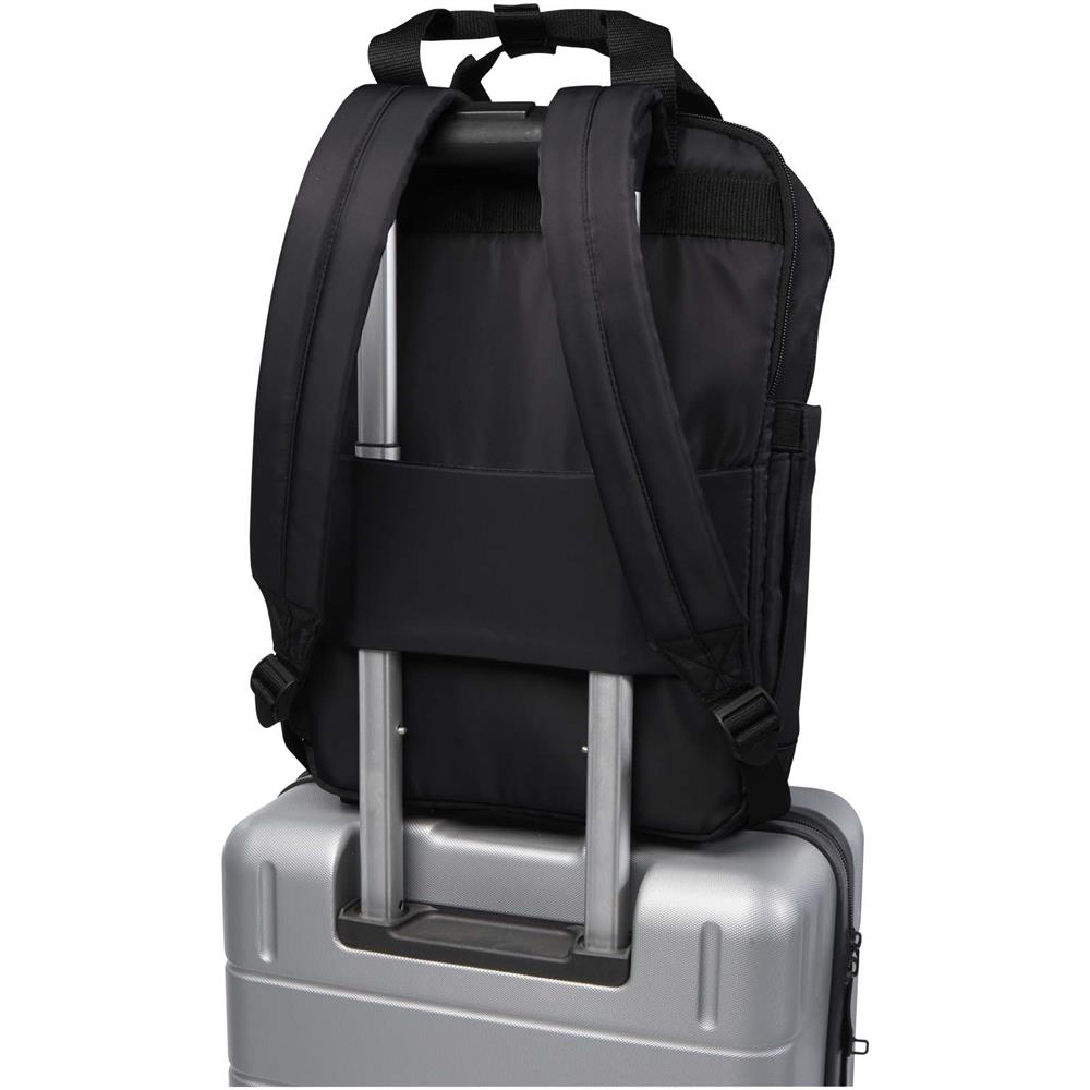 Der recycelte Trip Aware™ Laptop-Rucksack ist ein kompakter, leichter Begleiter für strukturierte Reisen und den Alltag. Hergestellt aus strapazierfähigem 290D-Twill-Polyester mit weicher gestrickter Rückseite und RPET 210D/PU Kunststoff-Futter, vereint er Funktionalität mit einem klaren, praktischen Design. Zwei Seitentaschen für Flaschen, Tragegriffe und gepolsterte Schulterriemen sorgen für Komfort. Die Fronttasche mit Reißverschluss bietet Platz für einen Reisepass, Stifte und ein Schlüsselband. Im Hauptfach ist Platz für ein Notebook oder Tablet. Ein separates 14" Laptopfach und ein Trolleyband machen ihn ideal für unterwegs. Jeder Artikel wird außerdem mit einem Aware™ Tracer geliefert. Diese innovative Funktion ermöglicht es den Nutzern, die Herkunft und den Weg ihres Artikels mithilfe eines QR-Codes nachzuvollziehen, wodurch die Transparenz der Lieferkette erhöht und eine stärkere Verbindung zwischen dem Produkt und seinem Herstellungsprozess fördert. Fassungsvermögen: 9 Liter.