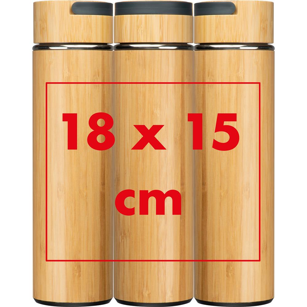 Doppelwandige Edelstahltrinkflasche mit Teesieb, Bambusummantelung, einem Füllvermögen von 500ml und einem Tragehenkel im Deckel. Ihre Werbung wird auf die Flasche gelasert.