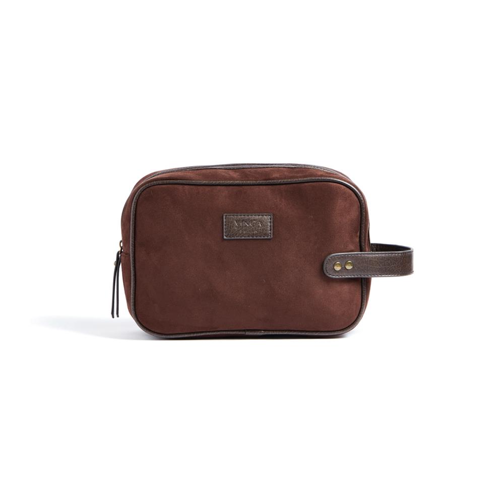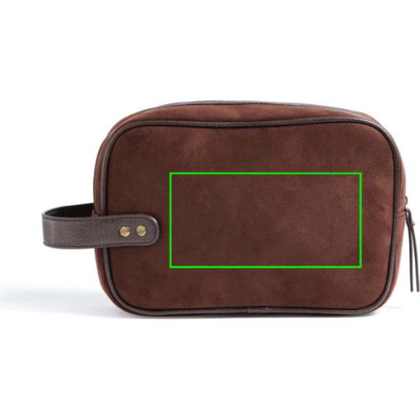 Klassische und dennoch moderne Kosmetiktasche aus Wildlederimitat mit Details aus PU. Mit dieser Tasche können Sie Ihre Hygieneartikel bequem zu Hause und auf Reisen stilvoll aufbewahren. Die Tasche hat eine handliche Größe und ist dank eines Riemens mit Messingdetails an der kurzen Seite leicht zu tragen.