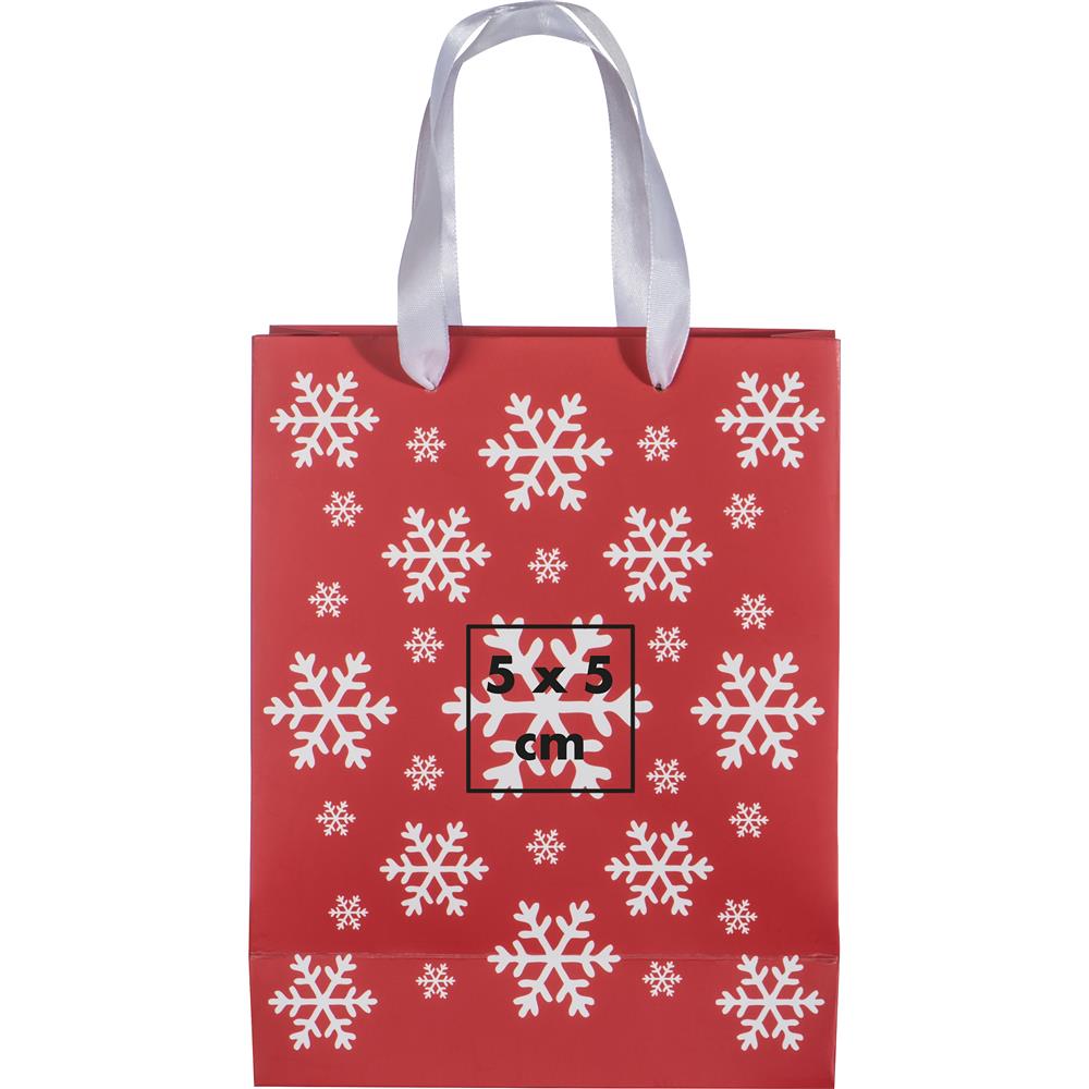 Weihnachtsgeschenktasche aus Papier mit Schneeflockenmotiv und zwei Tragehenkeln. Ihre Werbung drucken wir im Digitaldruck auf ein Etikett und bringen es auf der Tasche an.