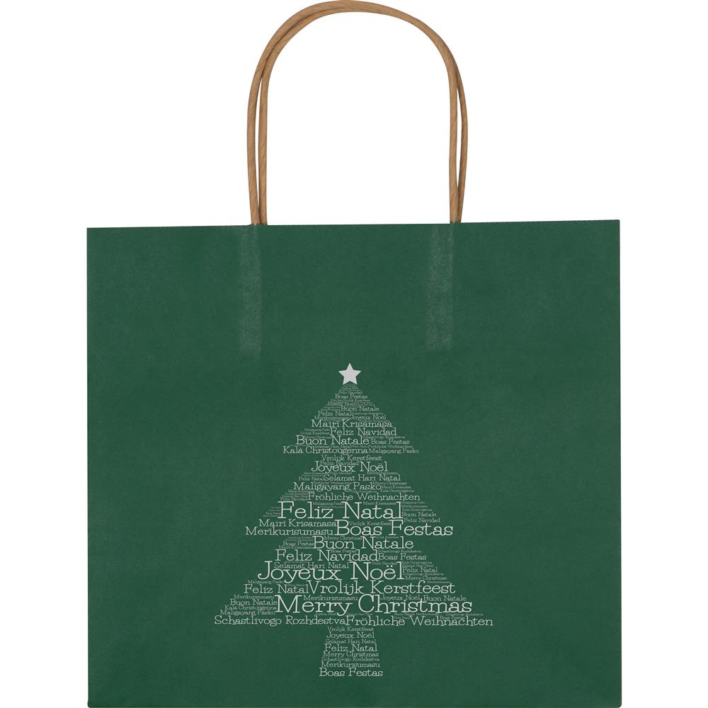 Kleine Weihnachtstasche aus recyceltem Papier mit weihnachtlichem Motiv. Ihre Werbung drucken wir auf die Rückseite.