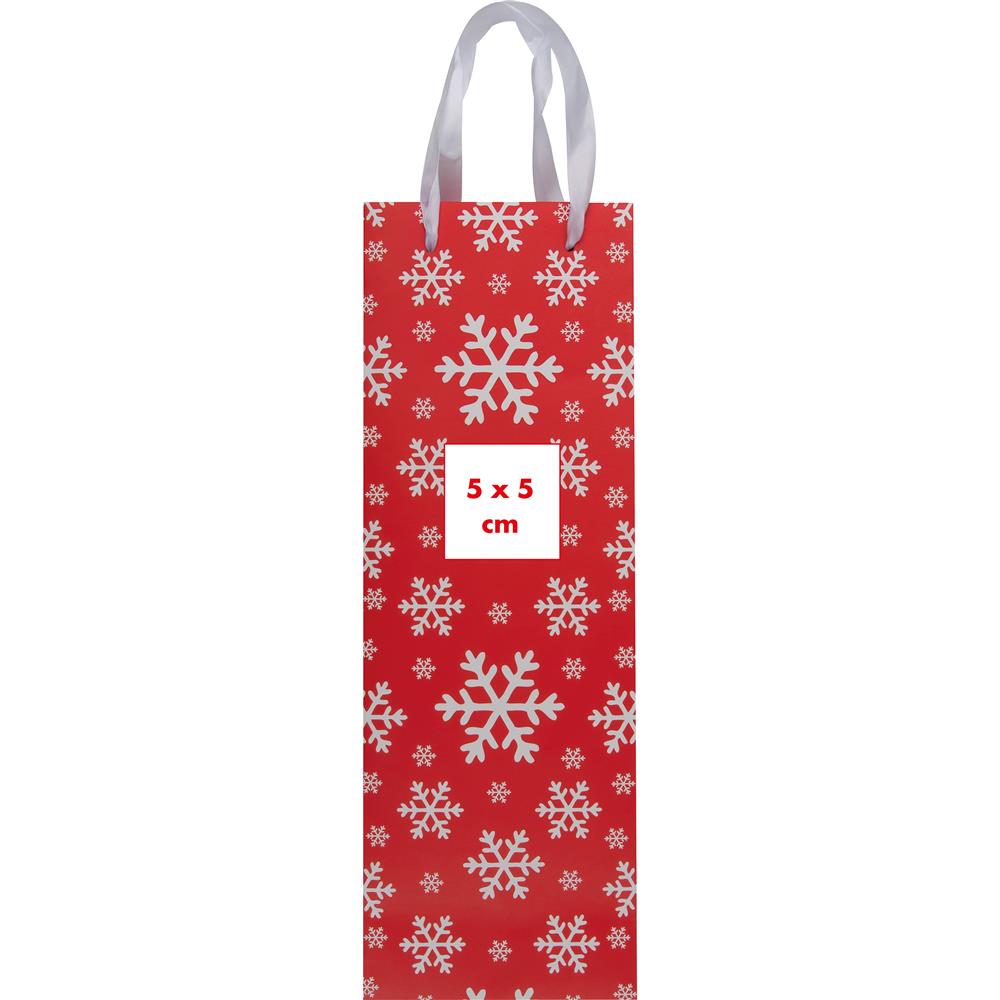 Weihnachtstragetasche aus Papier mit Schneeflockenmotiv und 2 Tragehenkeln. Geeignet für eine Wein-, Sekt- oder Champagnerflasche. Die Werbung wird digital auf ein Etikett gedruckt und an geeigneter Stelle angebracht.