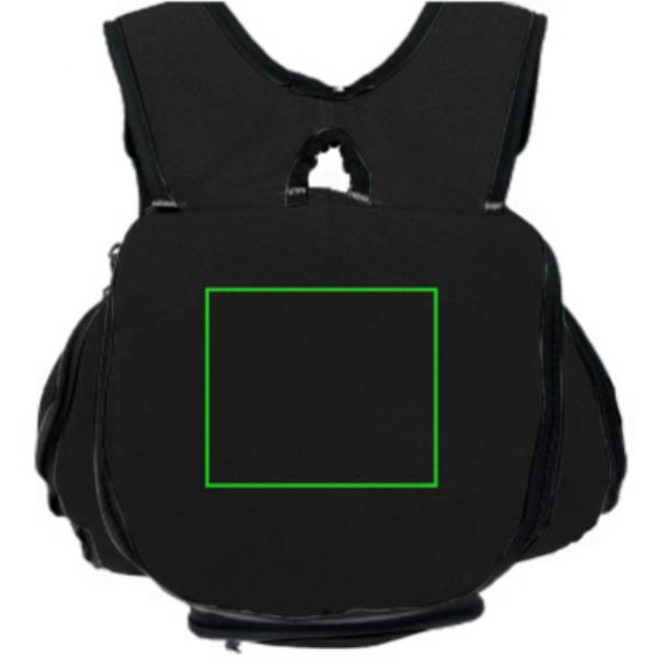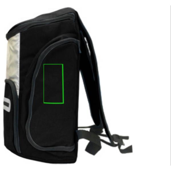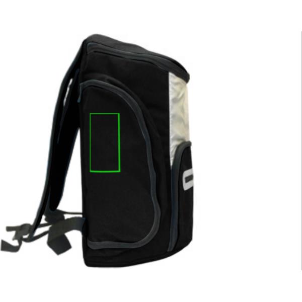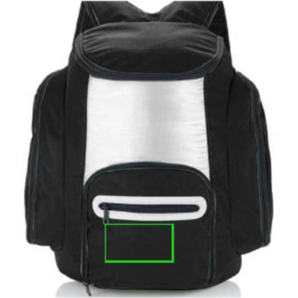600D Kühltaschenrucksack mit silberner Innenseite damit Essen und Getränke frisch und gekühlt bleiben. Auf der Vorderseite befindet sich noch eine weitere Tasche mit farbigen Details, die mit einem Reißverschluss geschlossen wird für alle anderen Kleinigkeiten.