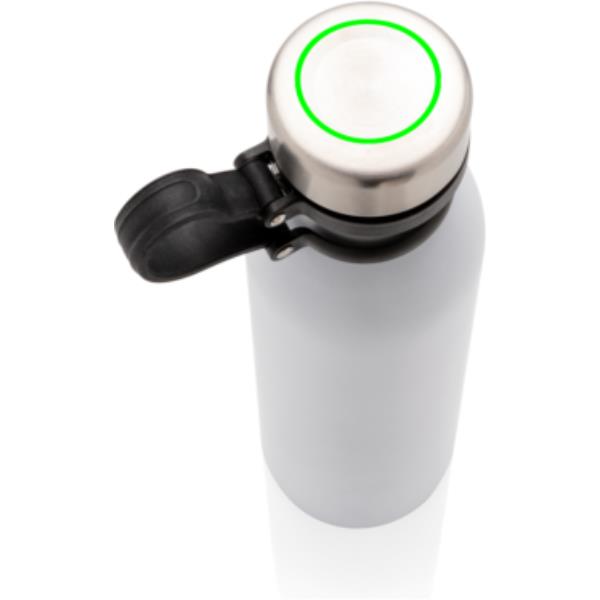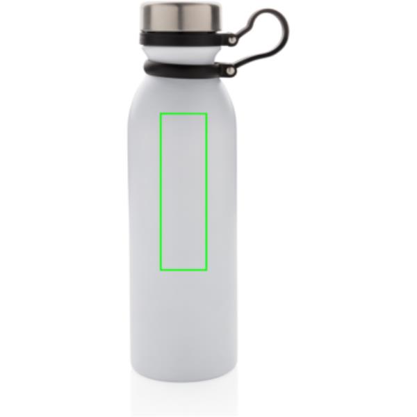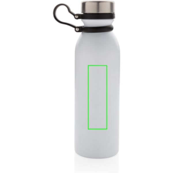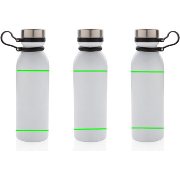Diese doppelwandige Kupfer-Vakuumisolierte Trinkflasche hält Ihre Getränke bis zu 8h warm und bis zu 24h kalt. Der schwarze Trageriemen aus Silikon ist ebenso am Deckel befestigt und muss somit beim Trinken nicht noch separat festgehalten werden. Die weiß-graue ist PMS Cool Gray 1. Inhalt: 600ml. Nur Handwäsche.
