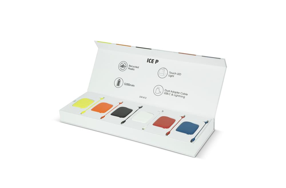 Präsentieren und betonen Sie die 6 leuchtenden Farben der Xoopar ICE P Powerbank 5000mAh. Diese Präsentationsbox zeigt das kompakte, schlanke und verspielte Design jeder Farboption für eine stilvolle und praktische Ladelösung.