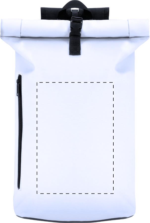 Rolltop-Rucksack aus weichem PU-Leder mit Schnallenverschluss, Reißverschluss-Fronttasche, gepolstertem Laptopfach (15"), gepolstertem Rücken und Schultergurten.