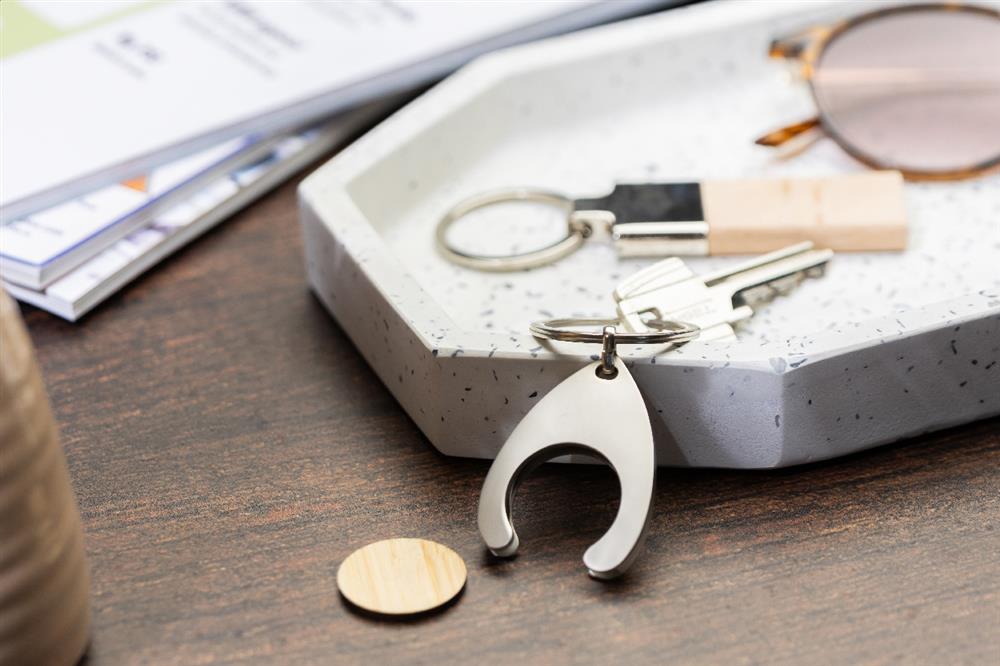Schlüsselanhänger aus Metall mit Einkaufswagenchip aus Bambus und Metallring. Münzgröße: ø23×2 mm.
